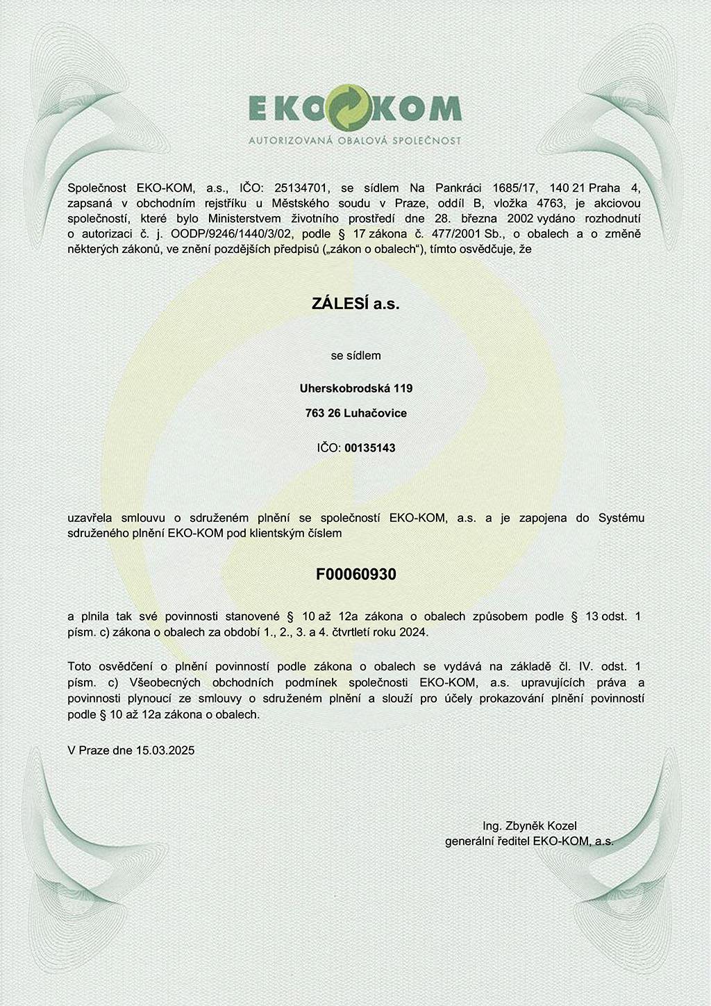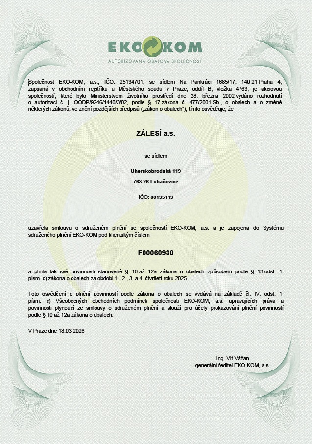 Jako výrobce spotřebního zboží obalů pro kosmetický, farmaceutický a potravinářský průmysl, je si firma Zálesí a.s. plně vědoma dopadů své činnosti na životní prostředí a na společnost jako celek. Dodržováním současných a budoucích předpisu a začleněním principů udržitelného rozvoje ve všech oblastech podnikání se firma Zálesí zavazuje k ochraně životního prostředí, zdraví a bezpečnosti.